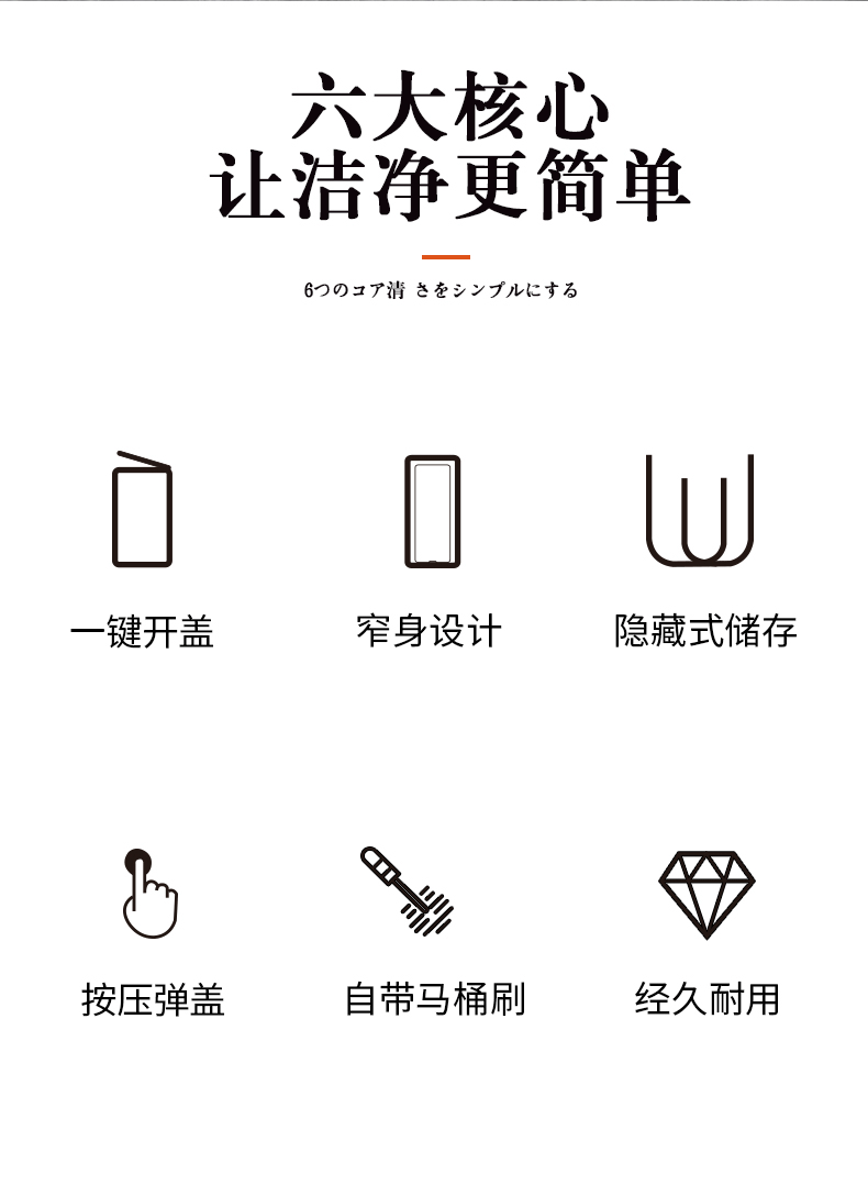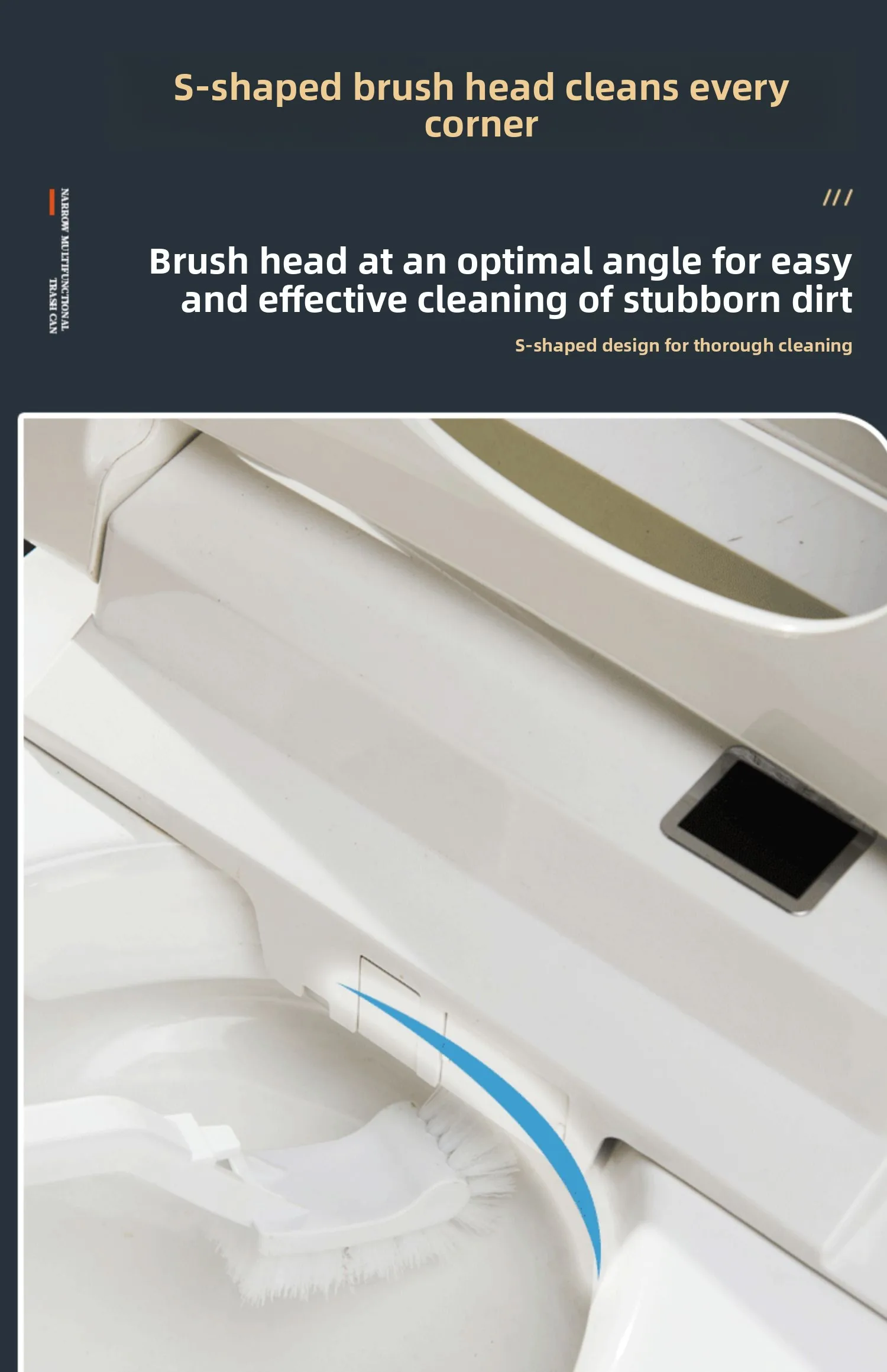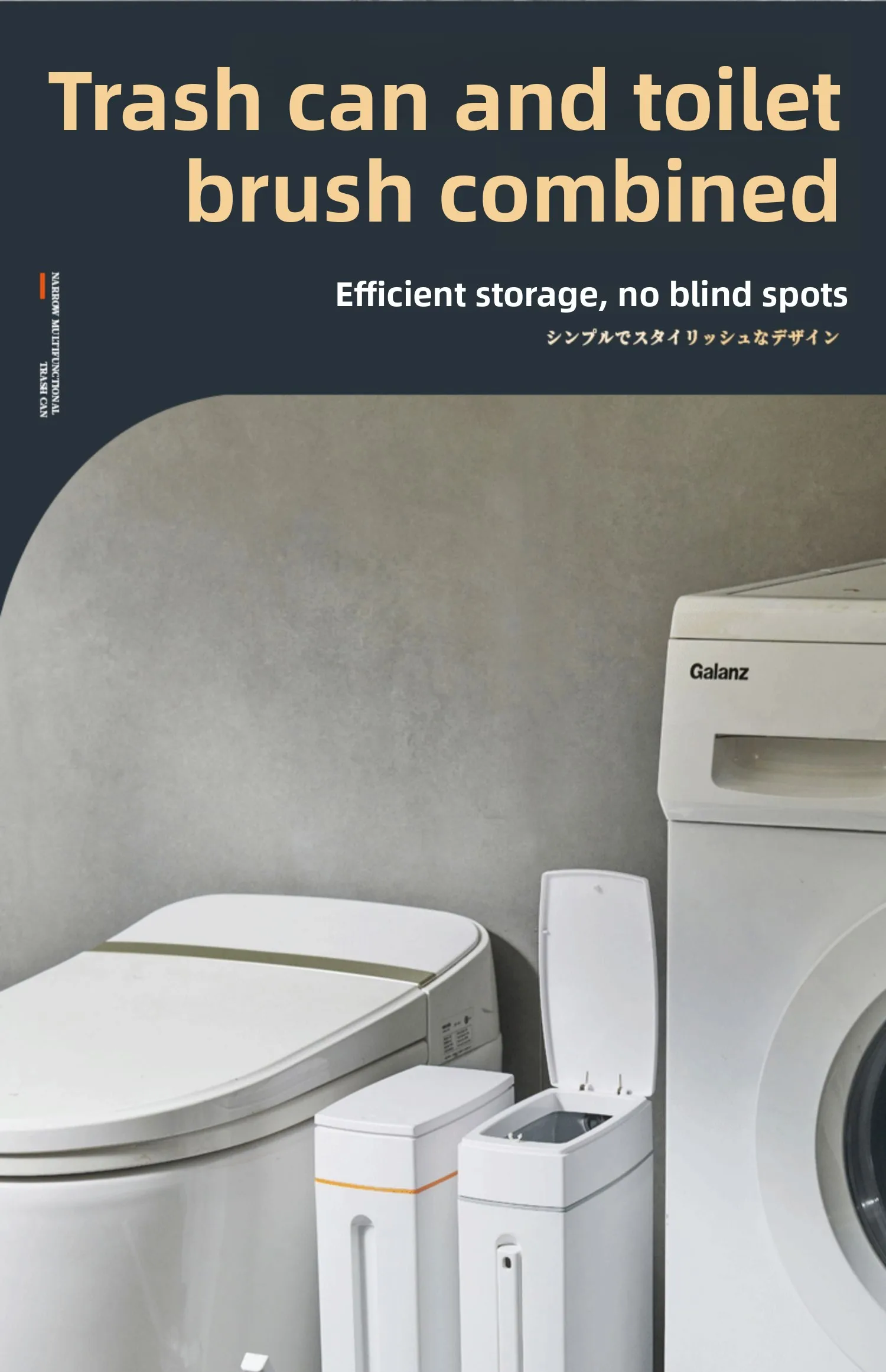 This bathroom trash can features an integrated toilet brush, providing convenience and space-saving design for your bathroom.
