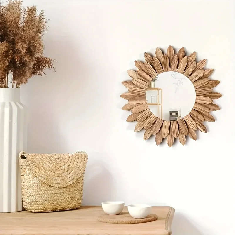 This Bohemian style sunflower wall mirror combines practicality and decorativeness, adding a unique artistic atmosphere to bedrooms and bathrooms.The main body is made of high-quality wood, with natural and clear textures, a warm and thick texture, which is sturdy and durable and not easy to deform, highlighting a natural and simple lifestyle.