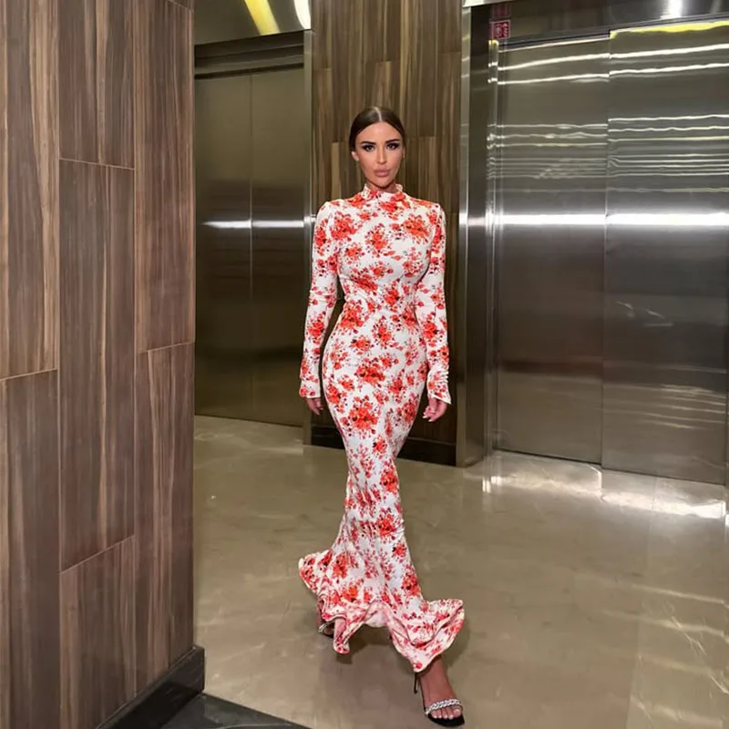 Floral Printed Dresses For Women Fashion Sexy Streetwear Casual Full Sleeves Turtleneck Slim Hip Wrap Long Vestidos Robes Female
