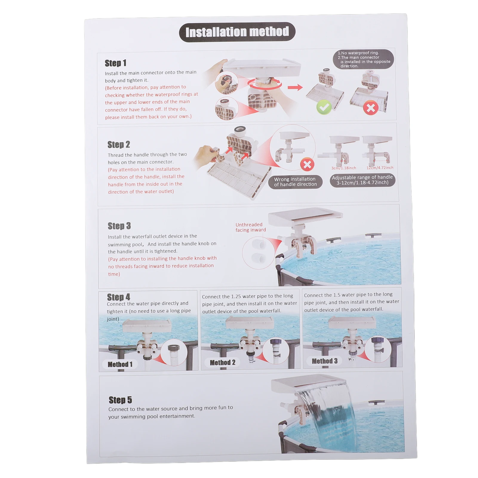 4. Sturdy Support: The stand pool waterfall has a solid supporting structure that can be stably fixed on the side of the pool, not easy to shake or tilt, ensuring safety during use.